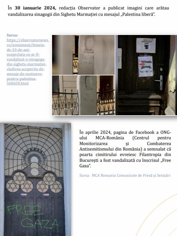Apoi arată poze cu sinagoga din Sighet, pe care ceva stângiști au scrijelit “Palestina Liberă” și au lipit o foaie de ușă.