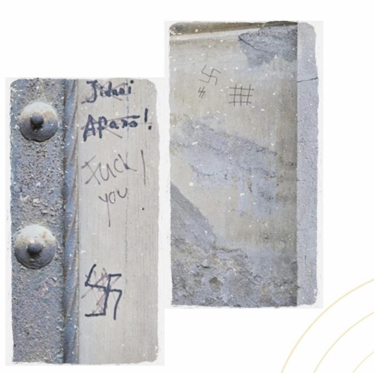 Un graffiti impresionant este “holocaust hypocrisy”, care se pare că a apărut la palatul Universității din București, în vecinătatea unui memorial holocaustic. Institutul Elie Wiesel spune că “Mesajul are un substrat antiiudaic (antisemitism religios), sugerând că textele biblice evreiești ar avea un conținut instigator la violență”.