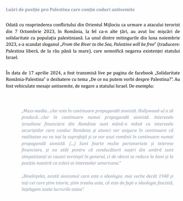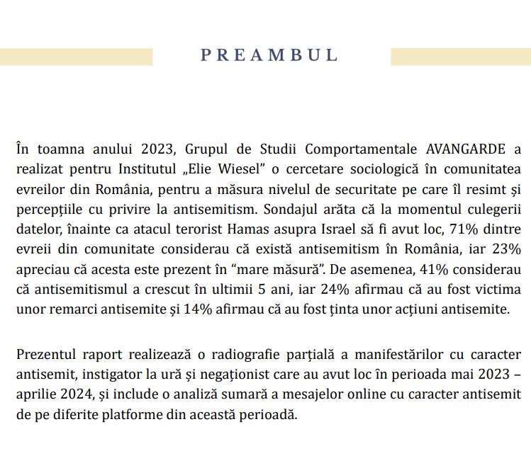 Preambulul începe cu lamentarea pentru 7 Octombrie, când HAMAS a intrat în teritoriile controlate de Israel pe sub nasul său cu permisiunea tacită a MOSSAD-ului. Raportul spune că acest eveniment a sporit antisemitismul la nivel internațional, se vorbește despre atacuri asupra sinagogilor și a jidanilor, dar nu se furnizează vreun exemplu concret sau poze cu aceste atacuri.