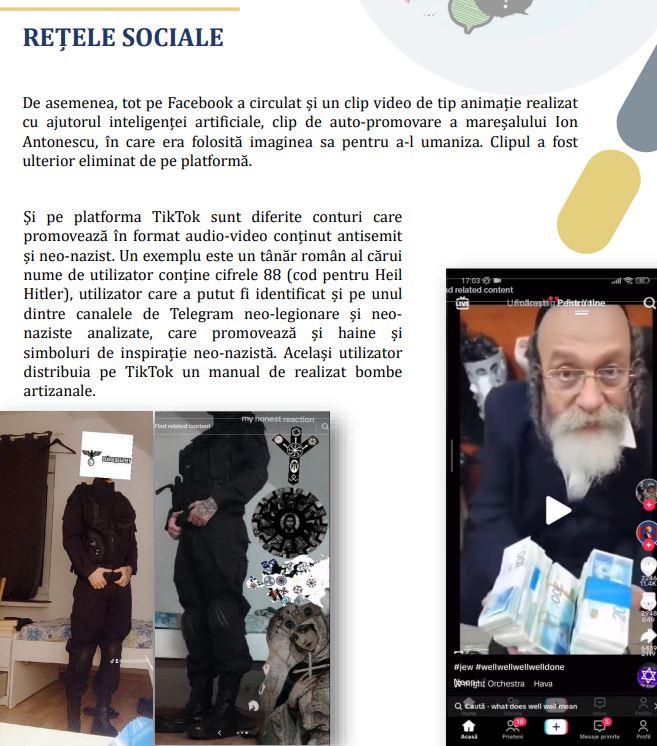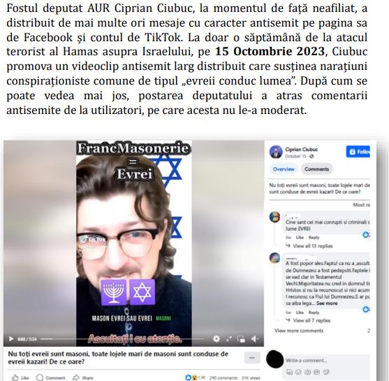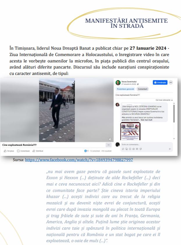 Apoi raportul pune o poză cu o personalitate a naționalismului românesc, Florin Măneanu, liderul Noua Dreaptă Banat, care a avut curajul să spună adevărul într-una din zilele internaționale holocaustice (sunt mai multe pe an). Acesta a identificat corect cine exploatează România, fapt care-i deranjează pe tovarășii de la institutul Elie Wiesel.
