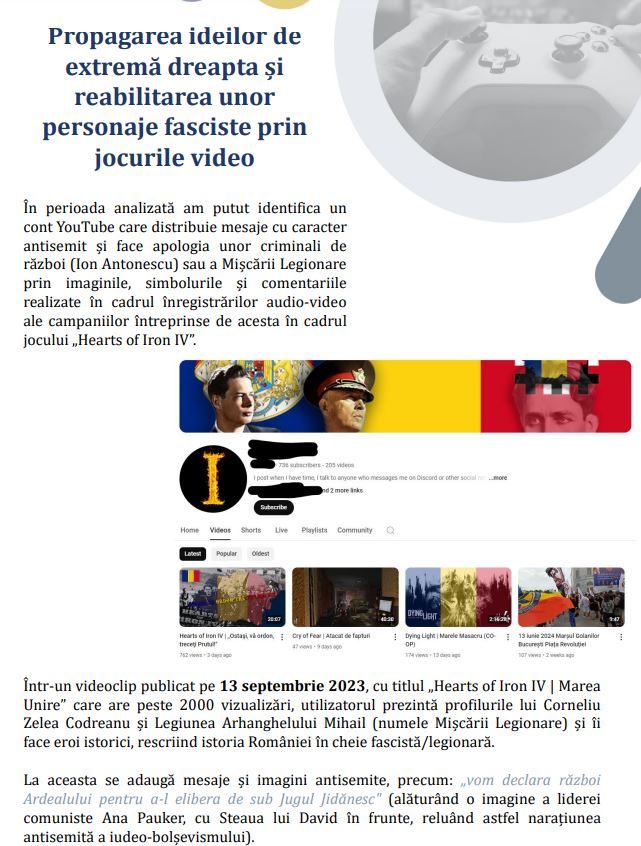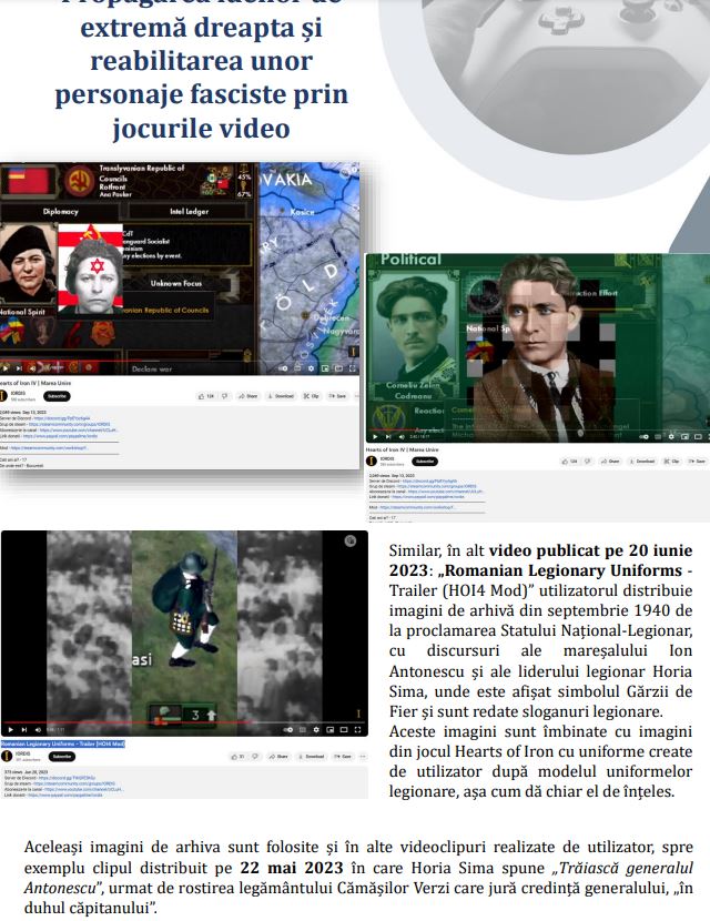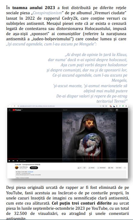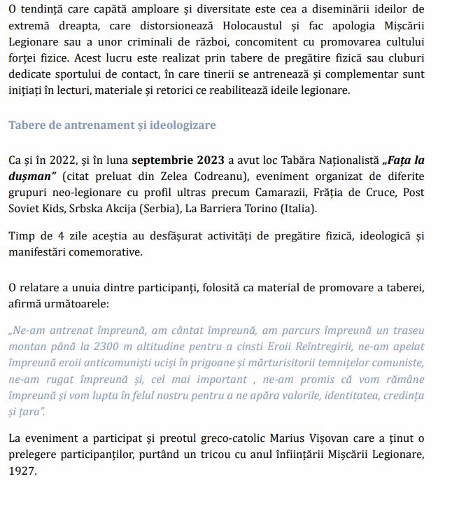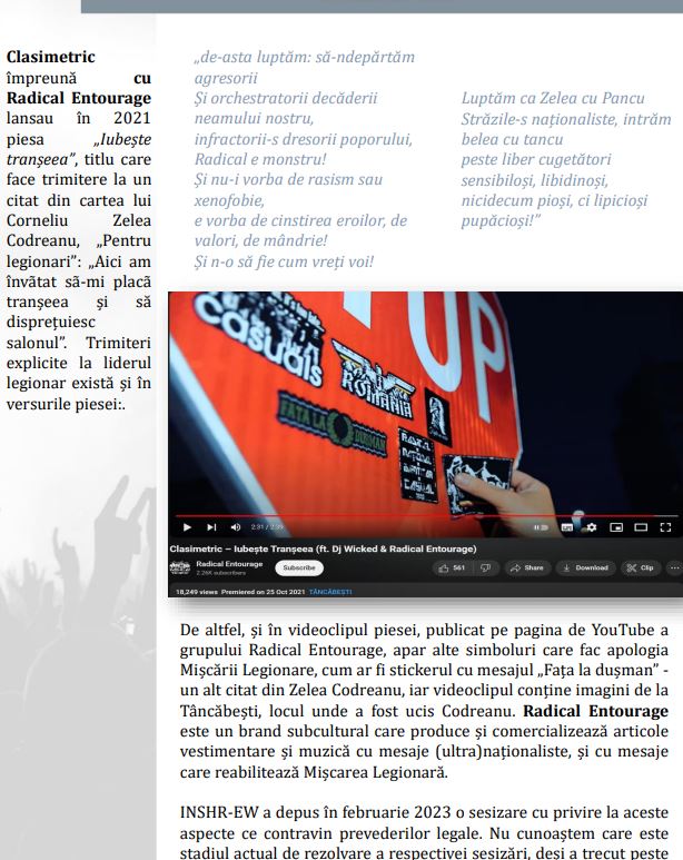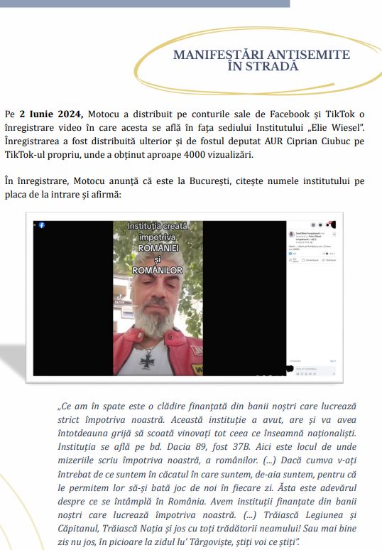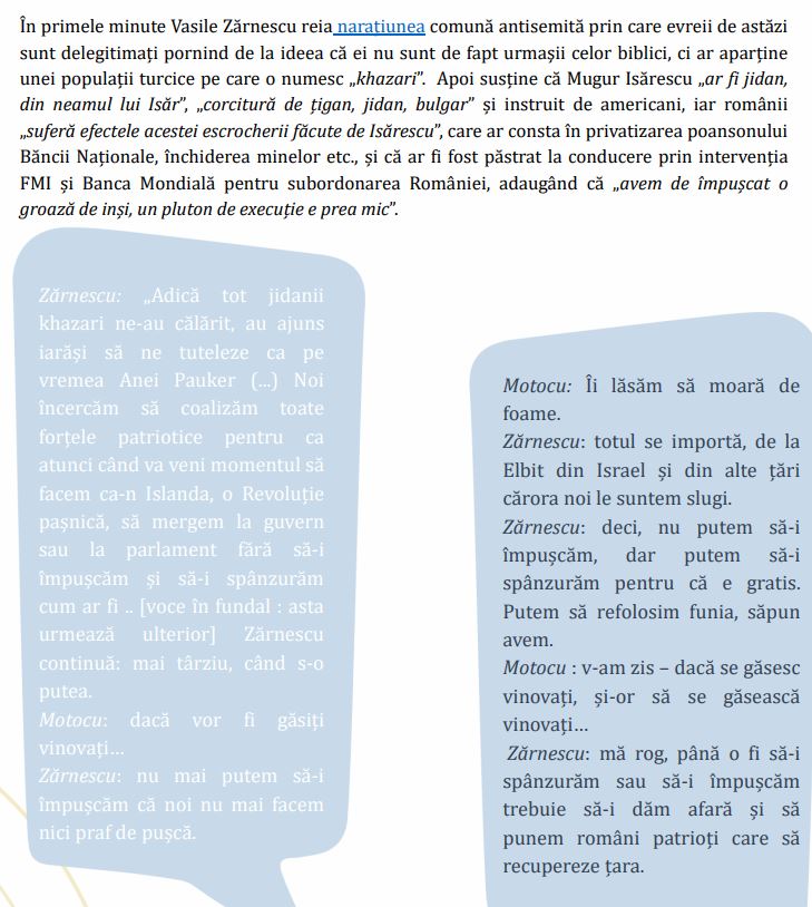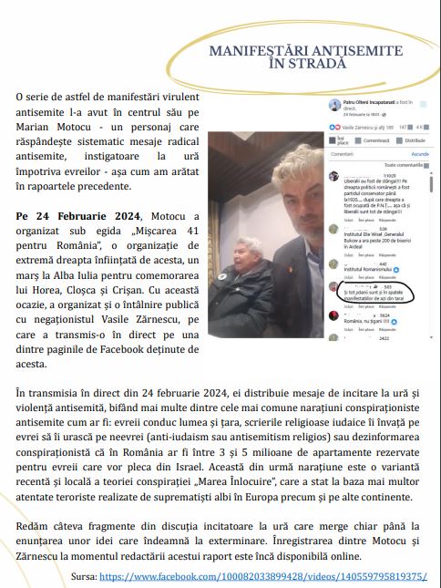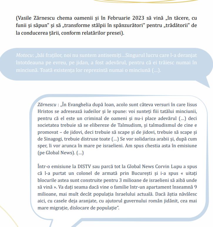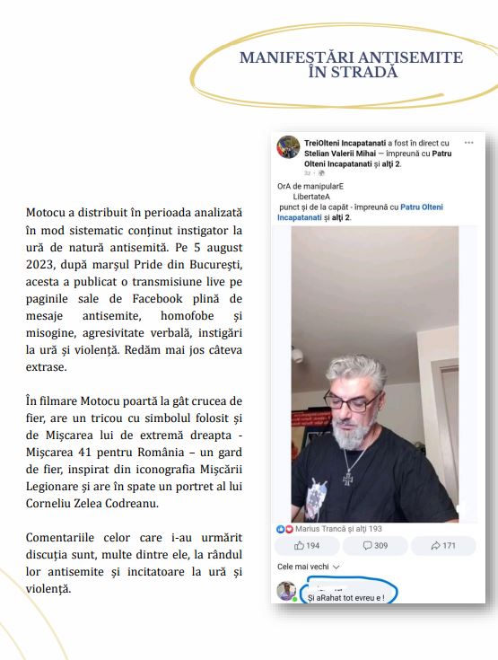 În fine, urmează pasajele despre Marian Motocu, o adevărată vedetă în raportul de acest an, căruia îi sunt dedicate câteva pagini. Ce-i deranjează la Motocu? Faptul că “răspândește sistematic mesaje radicale antisemite”, aceeași formulare au folosit-o cu privire la Incorect Politic acu câțiva ani. Urmează câteva fragmente dintr-un interviu dintre Motocu și legendarul colonel Vasile Zărnescu.
