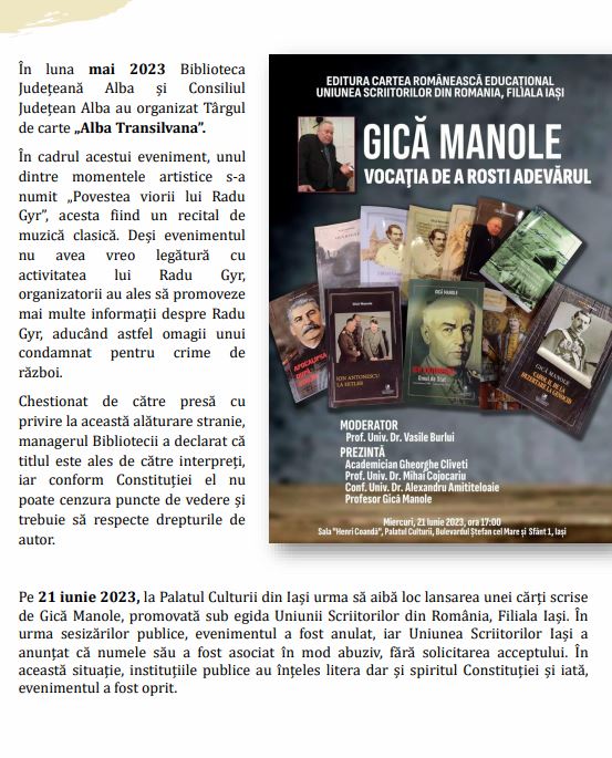 Institutul se laudă că a reușit să intimideze Palatul Culturii din Iași ca să-l determine să anuleze evenimentul la care trebuia să fie prezent Gică Manole.
