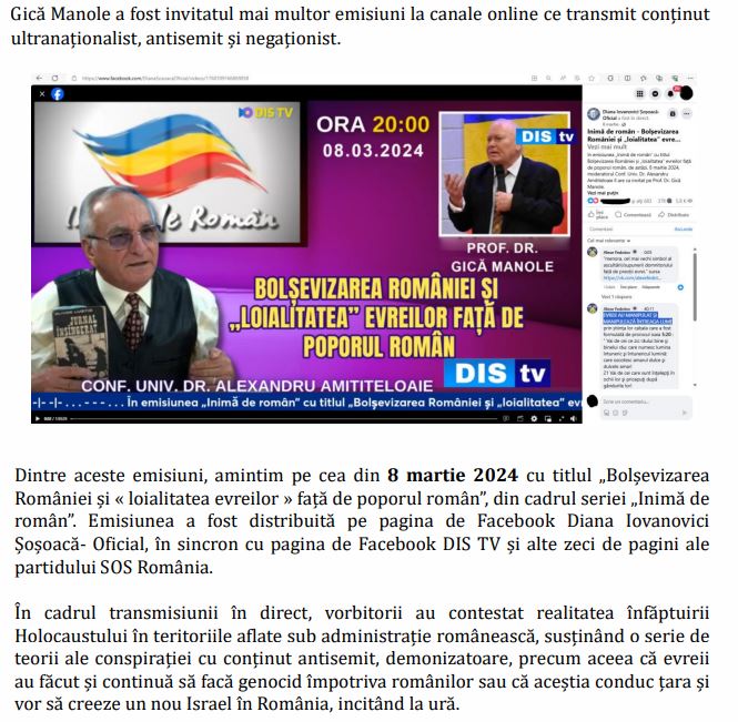 De asemenea este menționată emisiunea lui Alexandru Amititeloaie, publicata pe DISTV, unde Gică Manole demonstrează inexistența holocaustului românesc.