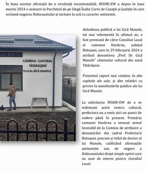 Este menționat și episodul tentativei de intimidare a Consiliului Local din comuna Havârna, care a denumit un centru cultural după profesorul Gică Manole.