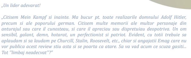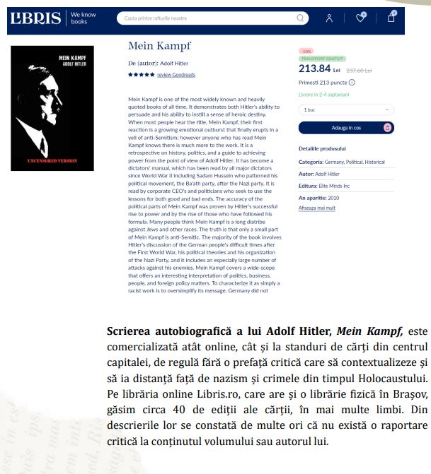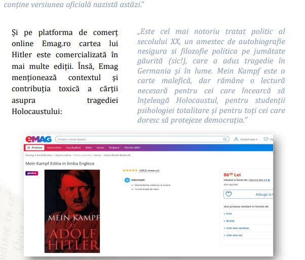 Spre deosebire de Libris, care oferă o descriere nepărtinitoare, pe Emag institutul remarcă o descriere apologetică față de narativa holocaustului. Alt compromis inutil care nu a scutit Emag-ul din a apărea în raport.