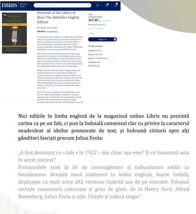 Tot pe Libris și pe Emag se pot găsi Protocoalele Înțeleptilor Sionului, altă carte care nu este ilegală sau interzisă în România și care divulgă planul iudaic pentru dominare mondială. Varianta disponibilă pe aceste magazine este traducerea lui Ion Moța din 1923. Institutul este deranjat de faptul că aceste cărți primesc recenzii de cinci stele pe emag.