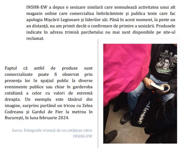 Ne anunță că au depus plângere pentru magazinul Ultras pentru comercializarea unor tricouri cu Antonescu și că dosarul a fost clasat, ceea ce reprezintă un semn de normalitate din partea autorităților care au lucruri mai bune de făcut decât să piardă timpul și resursele pentru niște băieți care fac tricouri cu un personaj istoric. În România există crime reale, infracțiuni grave, omoruri, violuri, etc. Dacă ar fi după INSHREW, prioritatea nr. 1 ar fi copiii care poartă tricouri cu Codreanu.