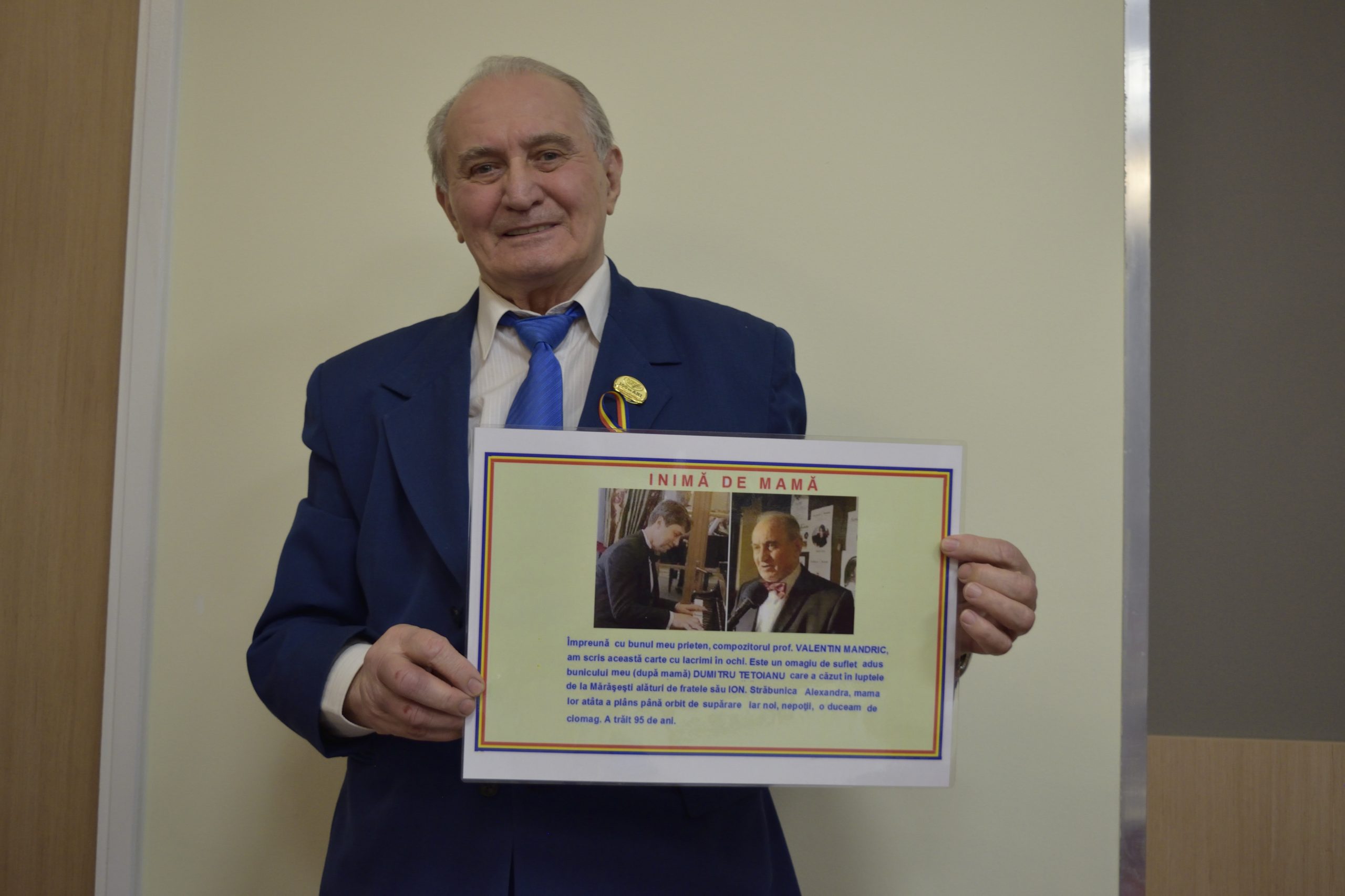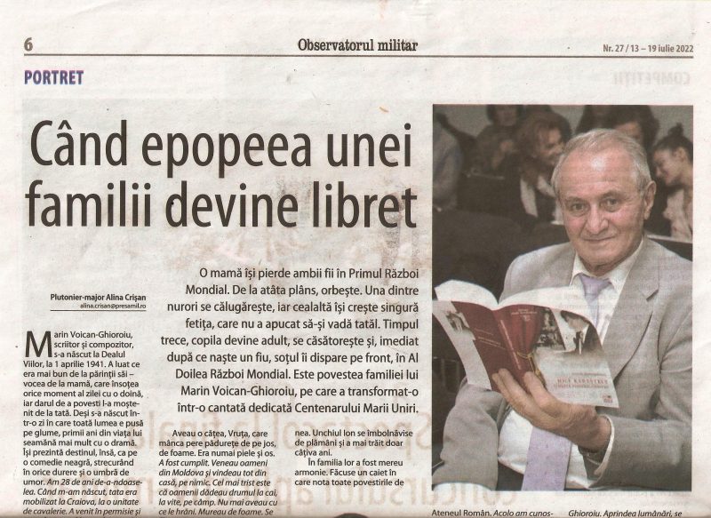 Atât libretul, pe care l-am scris cu lacrimi în ochi, trecând prin filtrul minţii scenele de luptă a bravilor ostaşi români în PRIMUL RĂZBOI MONDIAL, compoziţie dedicată Centenarului Unirii, prin transpunerea în acorduri muzicale de avânt dar şi de tristeţe răvăşitoare, prin care distinsul compozitor VALENTIN MANDRIC creionează cu înaltă măiestrie drama familii mele, a militarilor români care, în războiul pentru întregirea neamului, a oferit drept jertfă supremă pe cei doi fii (Dumitru – 27 ani şi Ion – 24 ani).