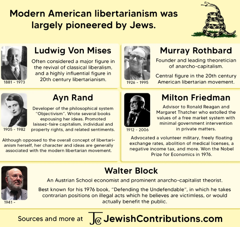 Nu este o exagerare să spunem că mișcarea libertariană modernă nu ar exista dacă nu ar fi acești evrei.[2]