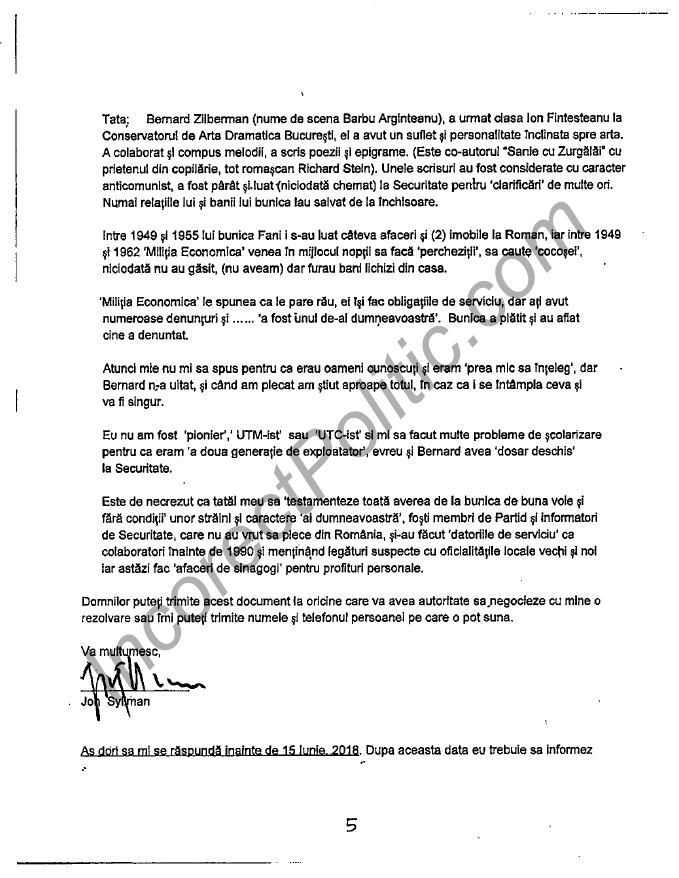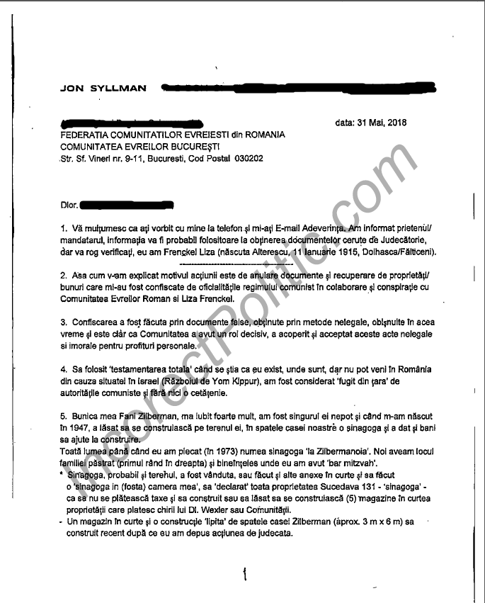 Prezentăm documentul adresat Federației Comunităților Evreiești din România, iscălit de dl. Jon Syllman, fost Zilberman, în care povestește cum trei generații de Zilberman (bunica, tata și fiul), au fost umiliți și jefuiți de comunitate, în colaborare cu nomenclatura comunistă…