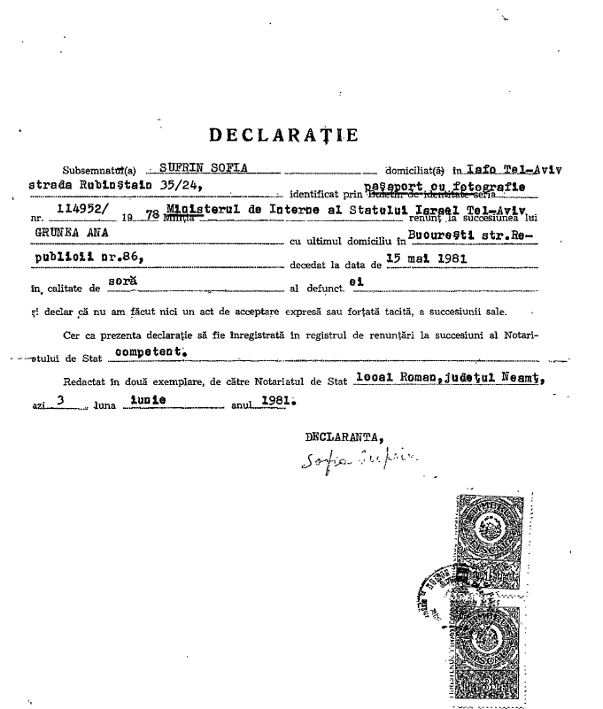 Dacă erai evreu în timpul comunismului și nu făceai parte din partid sau nu erai informator la Securitate, erai persecutat, iar ca să pleci din țară trebuia să pleci cu întreaga familie și să dai o declarație de renunțare la succesiune, completă, benevolă și nesilită. Nu se specifica în favoarea cui renunți la proprietățile tale, deci Miliția și Partidul sau Securitatea puteau pune mâna pe case și să le repartizeze după interese.