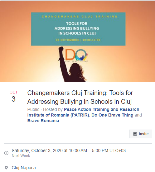 Acest program de training (offline) de 1 zi in Cluj-Napoca presupune implicarea într-un atelier practic cu instrumente și schimb de experiențe, bazându-se pe studii de caz și pe cele mai bune practici. Iar – pentru cei care doresc – există posibilitatea de a deveni direct implicați într-un program școlar din Cluj, pentru a lucra direct cu profesorii și tinerii pentru a ajuta la depășirea bullying-ului și pentru a crea școli sigure și sănătoase.