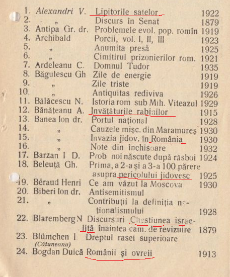 Despre presă. În frunte, stă, fireşte, organul Adevărul, al cărui comitet de redacţie se alcătuieşte din următoarele ilustraţii cuşer ale gazetăriei «române», ale căror nume le reproducem după actele unui proces de calomnie, în care numiţii figurează – se înţelege – ca inculpaţi (Curtea cu Juraţi de Ilfov, Octombrie 1905): B. Braunstein – zis B.Branisteanu; Albert Honigman – zis A. Fagure; A. (((Rosen))) – zis Nora; A. Fuchs – zis G. Mihail; S.(((Goldenberg))) – zis Munteanu; Lazăr Kastenbaum – zis Castelan; E. Feinsilber – zis E. Emilian; E. Weber – zis Adrian Verea, şi vor mai fi.