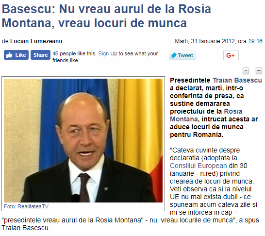 Practic, Traian Basescu încearcă să ne convingă că este imperios necesar să dăm undă verde unui proiect care ne ia peste 80% din aurul nostru, distruge patrimoniul natural și cultural unic în lume de la Roșia Montană și ne lasă moștenire patru munți rași de pe fata pământului și cel mai mare iaz de decantare cu cianuri din Europa. (…) Concentrația de cianuri din iazul de decantare la nivelul de miligram pe litru este de o mie de ori mai mare decât concentrația de microgram pe litru la care peștii sunt deja afectați și chiar mor.