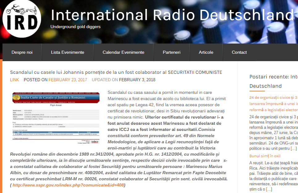 Marius Albin Marinescu după ce a fost scos din acel spatiu , la citiva ani, și-a deschis un ziar. Justitiarul. Acolo scriau dubioși precum MIRCEA DOGARU de exemplu, ziarul fiind unul de orientare fascistă, anitsasească si anti maghiară. Ani de zile l-a tocat pe Johannis repetând la nesfarsit povestea cu casele si copiii, exact așa cum azi o auziți la CĂCAT TV sau FENTENA 3. Fostul colaborator al securității , MARINESCU PRIMEA ANUAL DE LA SSPR SUME COLOSALE PENTRU A SCOATE EDITII JUBILIARE PT REVOLUTIONARI. Aceste sume erau cam de 3-4 ori mai mari decit costurile reale ale ediției și diferenta era impartită cu smecherii din Sibiu, inclusiv cu cel de la Bucuresti care ii dădea fondurile. Adică sifona bani de la stat. Aflând faptul ca acesta e un fost colaborator al securității l-am atacat in presa cu acest lucru, si firesc, m-a cistigat. Spun firesc, pentru că în acea perioadă încă se urla că noi muncim, nu gândim. După citiva ani ICCJ se pronunța asupra acestuia CĂ ESTE COLABORATOR AL SECURITATII, deci omul mă câștigase oarecum pe nemerit