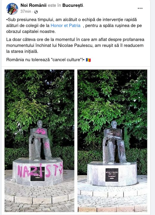 La doar câteva ore de la momentul în care am aflat despre profanarea monumentului închinat lui Nicolae Paulescu, am reușit să îl readucem la starea inițială.