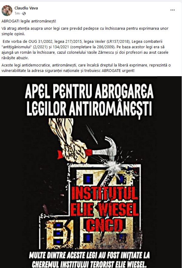 Este vorba de Claudiu Vava, membru AUR în județul Dolj, care a anunțat public pe pagina sa de Facebook necesitatea abrogării legilor care prevăd pedepse cu închisoarea pentru anumite opinii. Acesta a numit fiecare lege care încalcă dreptul la liberă exprimare și a subliniat că existența lor reprezintă o vulnerabilitate la adresa siguranței naționale.