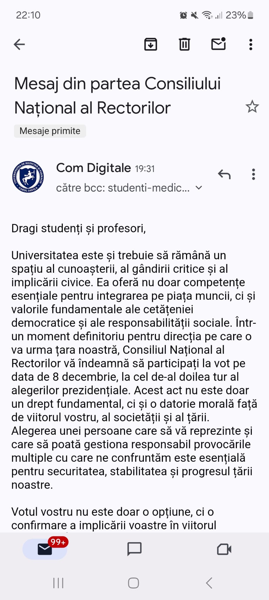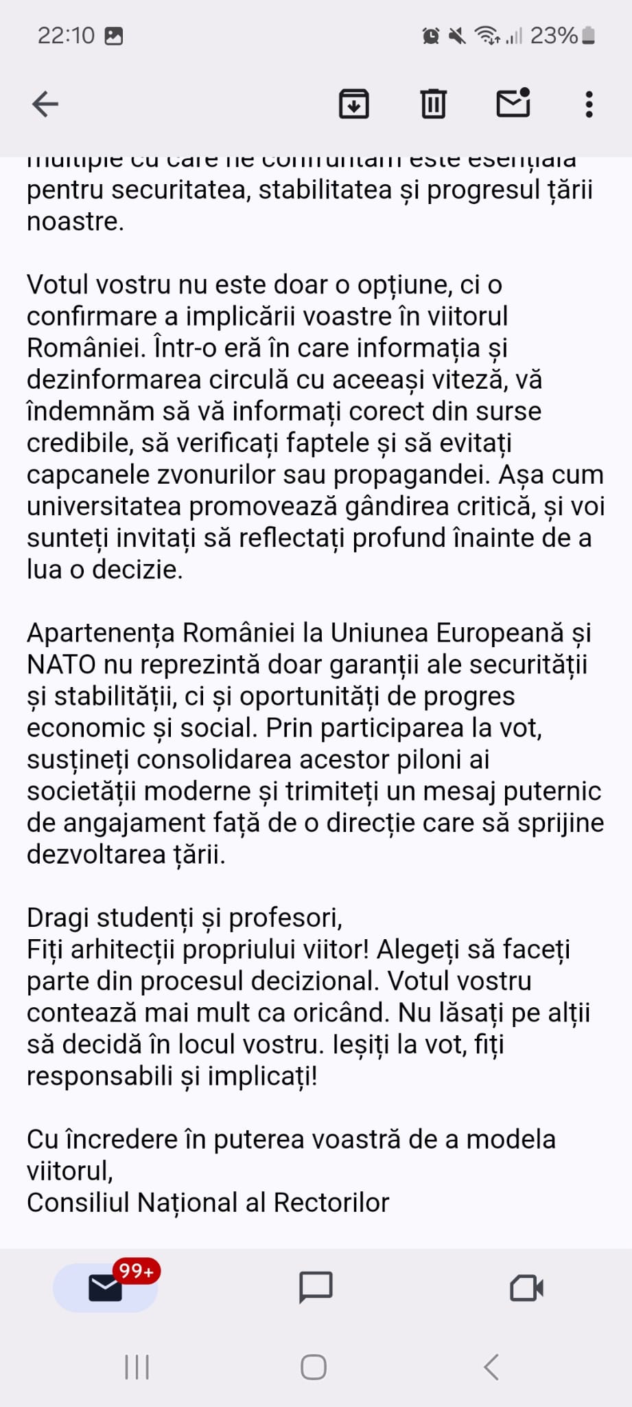 Dacă acest comunicat motivat ideologic nu era suficient, Consiliul Național al Rectorilor a emis și el un comunicat prin care îndeamnă lumea să fie pro-NATO, după cum a făcut și BOR, a cărui conducere este compromisă. E dezgustător să vezi câtă politică se face în universități. Măcar dacă s-ar face politică bună, pro-românească, dar peste tot mesajul e la fel: Trebuie să rămânem o colonie! Nu vă pună dracu să vreți suveranitate!