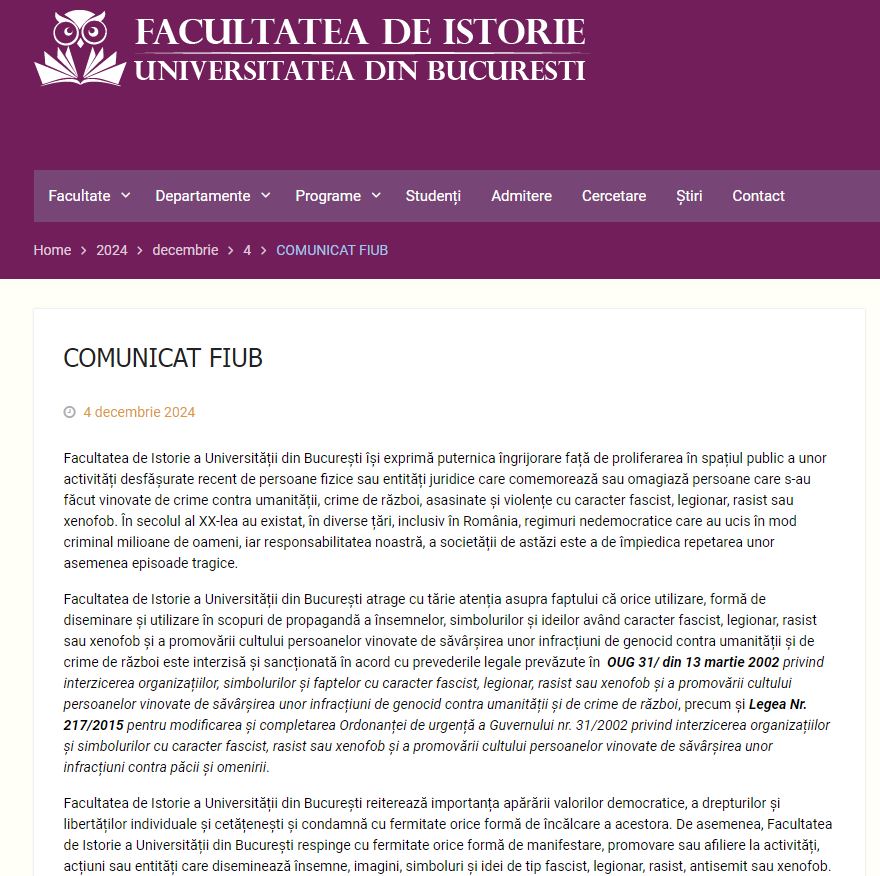 Facultatea de Istorie a Universității din București își exprimă puternica îngrijorare față de proliferarea în spațiul public a unor activități desfășurate recent de persoane fizice sau entități juridice care comemorează sau omagiază persoane care s-au făcut vinovate de crime contra umanității, crime de război, asasinate și violențe cu caracter fascist, legionar, rasist sau xenofob. În secolul al XX-lea au existat, în diverse țări, inclusiv în România, regimuri nedemocratice care au ucis în mod criminal milioane de oameni, iar responsabilitatea noastră, a societății de astăzi este a de împiedica repetarea unor asemenea episoade tragice.