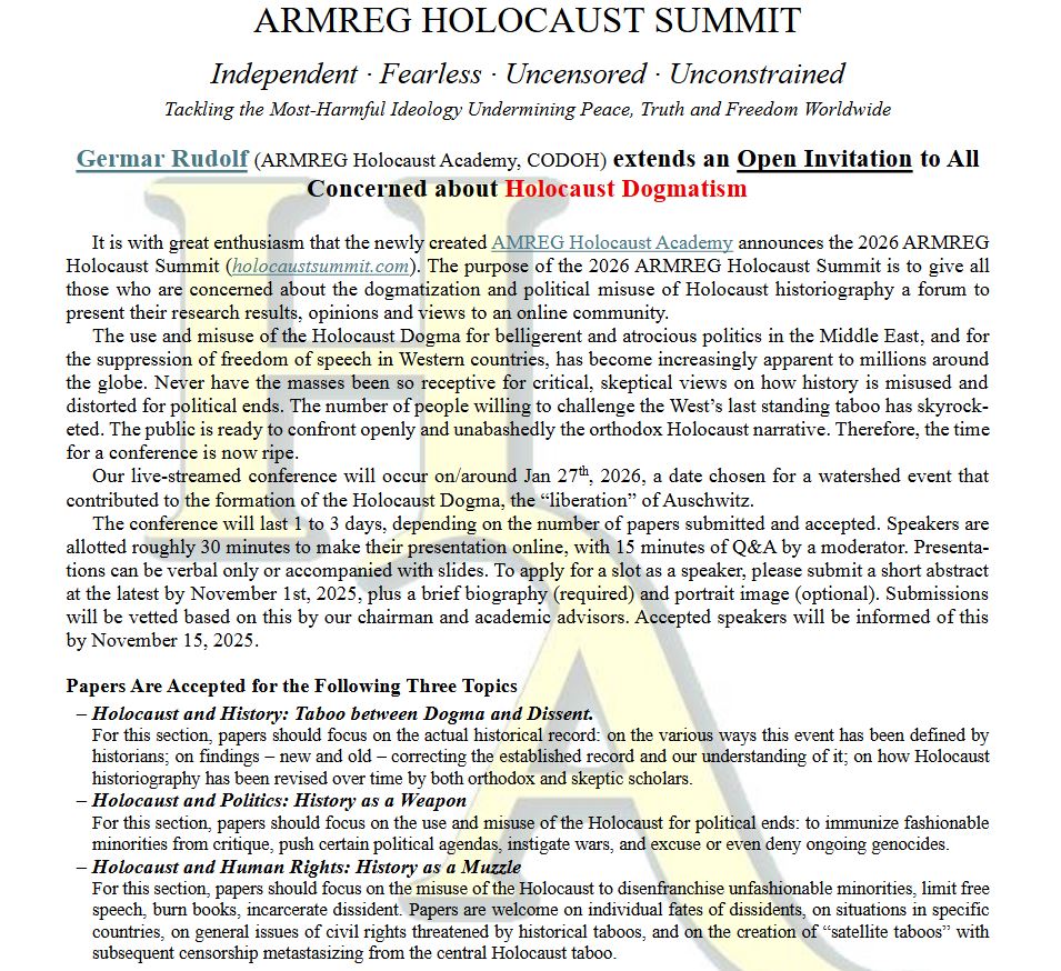 A crescut într-adevăr numărul oamenilor dispuși să conteste ultimul tabu al Occidentului, dogma idolatriei holocaustice, promovată ca falsă religie a întregii lumi. Popoarele sunt pregătite să înfrunte pe față narativa holocaustică. Colocviul internațional ARMREG – 2026 pică la țanc. Lucrările lui vor fi transmise direct, în jurul datei de 27 ianuarie 2026, zi aleasă pentru reamintirea falsei „eliberări” a lagărului Auschwitz de către armata bolșevică a fostei Uniuni Sovietice. Colocviul va dura între una și trei zile, funcție de numărul de lucrări trimise și acceptate.