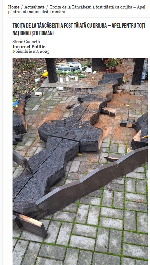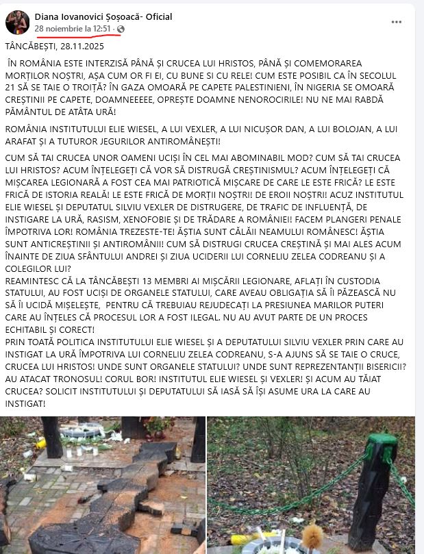Pentru dreapta informare: în primul rând, în ce privește “liderii” politici, singurul om politic care a reacționat în aceeași zi, la câteva ore după ce pozele cu troița tăiată au circulat pozele pe Internet, a fost Diana Șoșoacă, prin această postare.