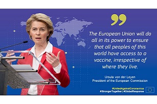 De asemenea, Comisia Europeană se angajează să se asigure că toți cei care au nevoie de un vaccin îl primesc oriunde în lume și nu numai acasă. Nimeni nu va fi în siguranță până când toată lumea nu este în siguranță. Acesta este motivul pentru care a strâns aproape 16 miliarde de euro începând cu 4 mai 2020 în cadrul Coronavirus Global Response , acțiunea globală pentru acces universal la teste, tratamente și vaccinuri împotriva coronavirusului și pentru recuperarea globală.