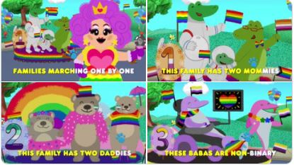 Travestitul conduce corul care cântă o melodie care promovează ideologia LGBTQ. Cântecul conține cuvinte precum „queer”, „trans”, „bi” sau „pan” și „non-binar”, care sunt scrise pe ecran pentru ca micuții să le poată citi și cânta și ei.