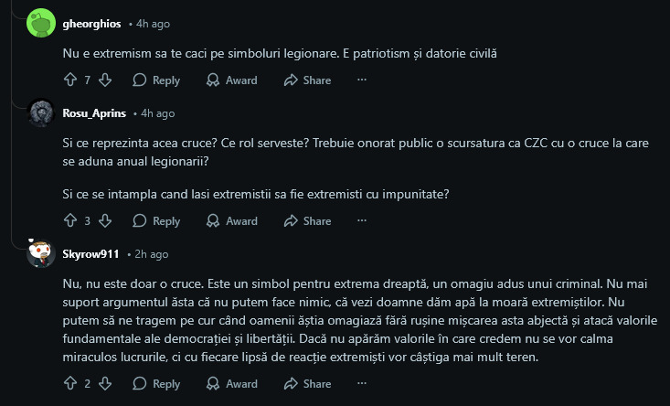 Auzi ce mesaje “legionari nu sunt”oameni ” pai mai omule nu pentru dastea îi condamnați pe ei,in fine stim cu toți adevărul legionarismul a ucis numai 5-6 oameni,acestia find Iorga si carolisti morți la Jilava,numai asasinatul căpitanului si ai martirilor de la Tâncăbești îi face pe carolisti raul mai mare, sa nu mai zicem de milioanele de morți cauzate de PCR,urmasi carora acești misei se închină