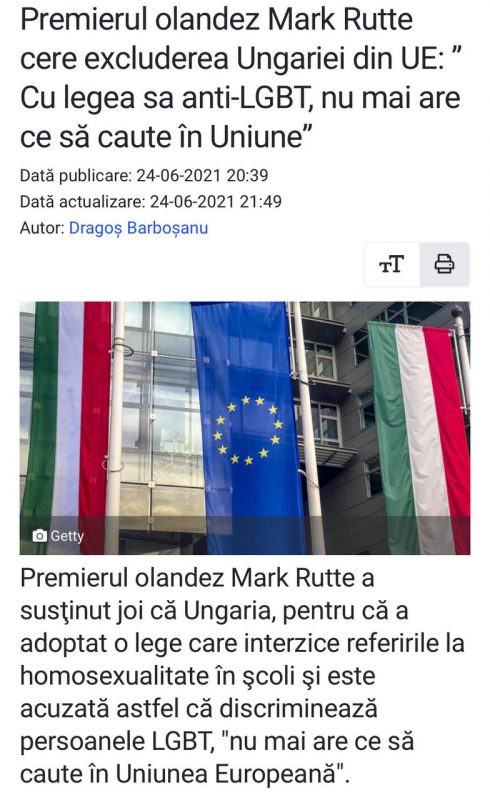 “Cu legea anti-LGBT, Ungaria nu mai are ce să caute în Uniunea Europeană” susține premierul olandez Mark Rutte