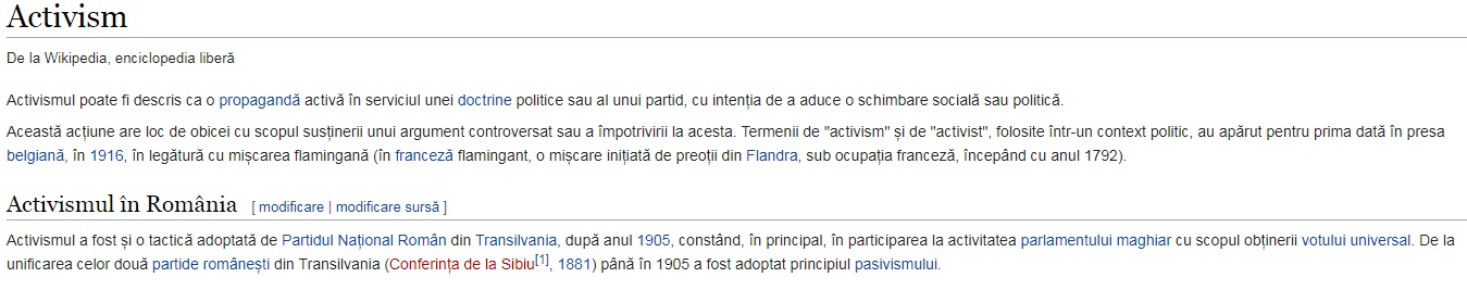 Pagina româneasca de Wikipedia nu ne oferă prea multe lămuriri despre activism, decât o definiție vaga, o referință istorică și o listă cu tipuri de activism, la care din nou nu ne sunt oferite prea multe detalii.
