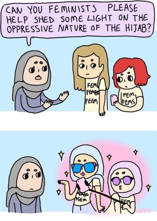 Feministele promovează și Islamul, unele numind Islamul cea mai feministă religie. Desigur totul pentru a susține politica granițelor deschise cu care se fac o grămada de bani din traficul uman, traficul de droguri, traficul de carne vie, piețele de sclavi în Libia, și din Qatar, băieți minori pe care îi abuzează sexual și îi folosesc și santajaza, folosindu-i după bunul plac, obligându-i să facă lucruri ilegale.