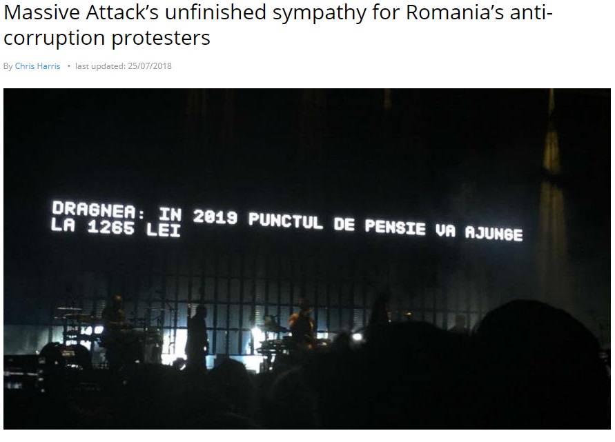 Massive Attack (formație care îmi plăcea extrem de mult acum ceva ani, dar pe care am decis să o boicotez total) afișând mesaje anti-PSD, marca #coruptiaucide, anul acesta în București.