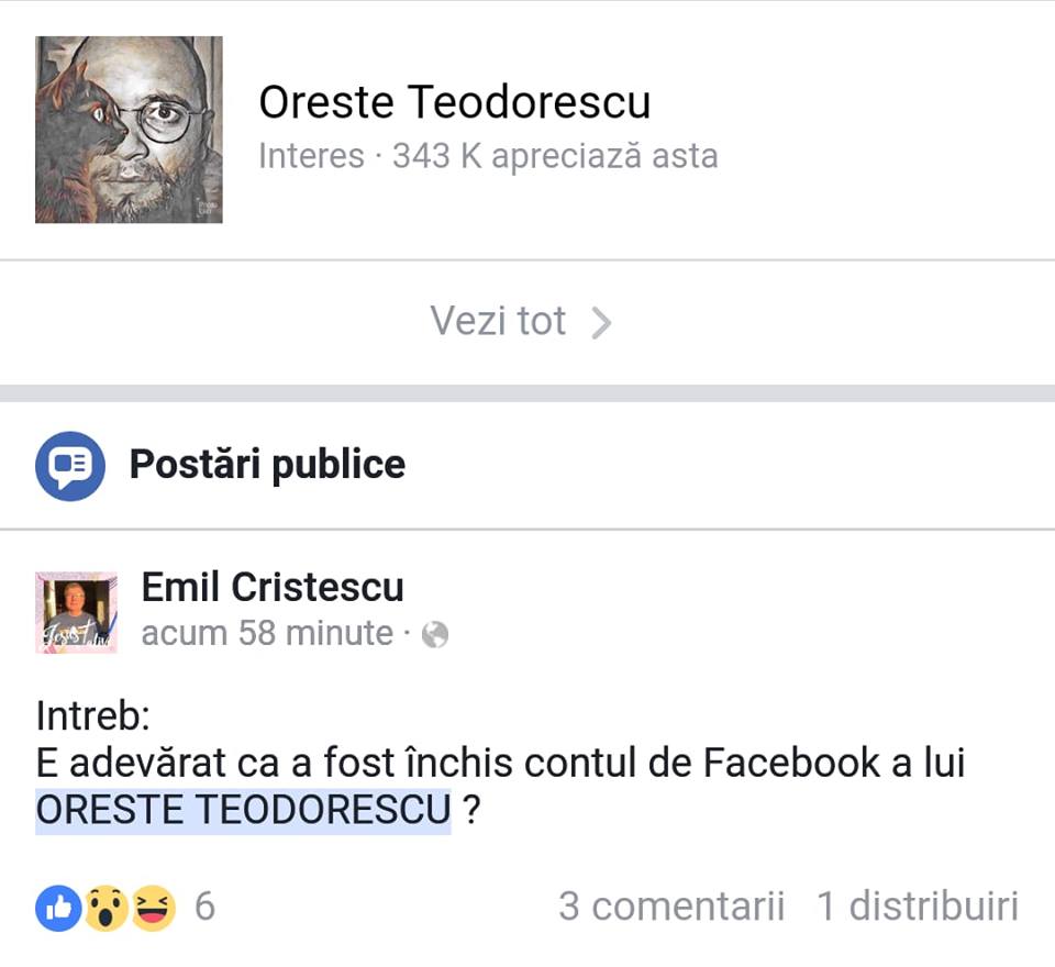 Proteste Teodorescu, după ce a mai instigat puțin și a rugat ONU să îi ajute în războiul împortiva jandarmeriei, a fost iar suspendat de pe Facebook.