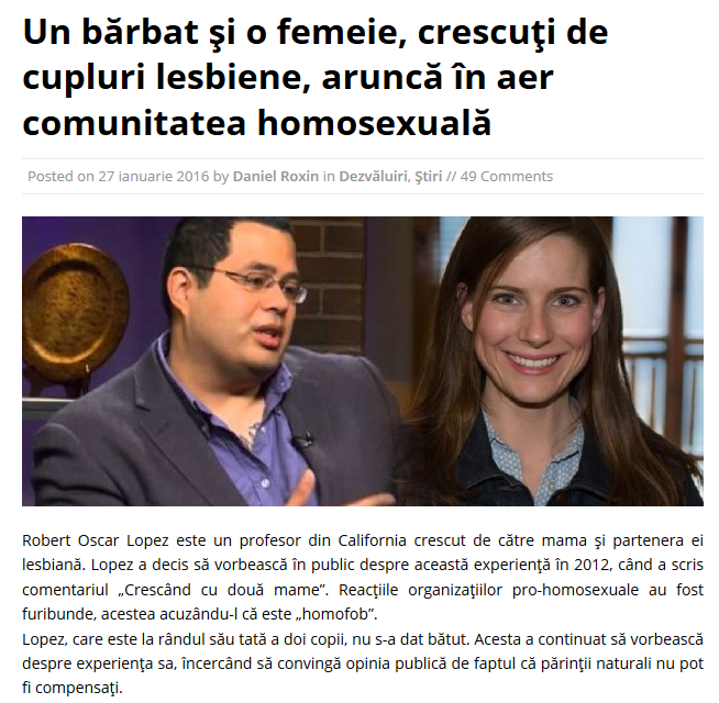 În plus, aceștia susțin că militanții pro-gay nu le dau voie copiilor din acele familii să-și spună opinia și să povestească experiența. La noi, unii le iau apărarea sub pretextul democrației, drepturilor omului sau progresismului și cu scuze de genul: ,,dar când tatăl e beat și își bate nevasta, asta e familie tradițională? Mai bine crescut de un cuplu de gay decât de o familie denaturată” deviind de la subiect, aceștia uită că și ei provin tot din familii normale și că mereu au avut nevoie și de o mamă și de un tată nu de doi tați sau două mame.