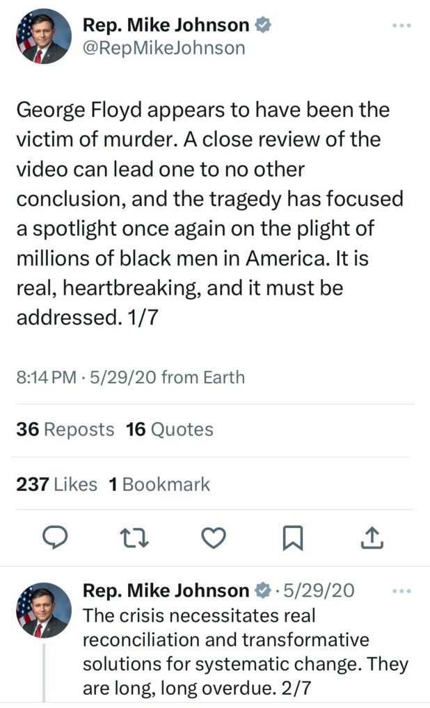 Ei bine, Mike Johnson, care săptămâna trecută a mers la Columbia pentru a amenința că va trimite armata să ucidă protestatarii pro-Palestina, era la televizor vorbind despre abuzurile negrilor.