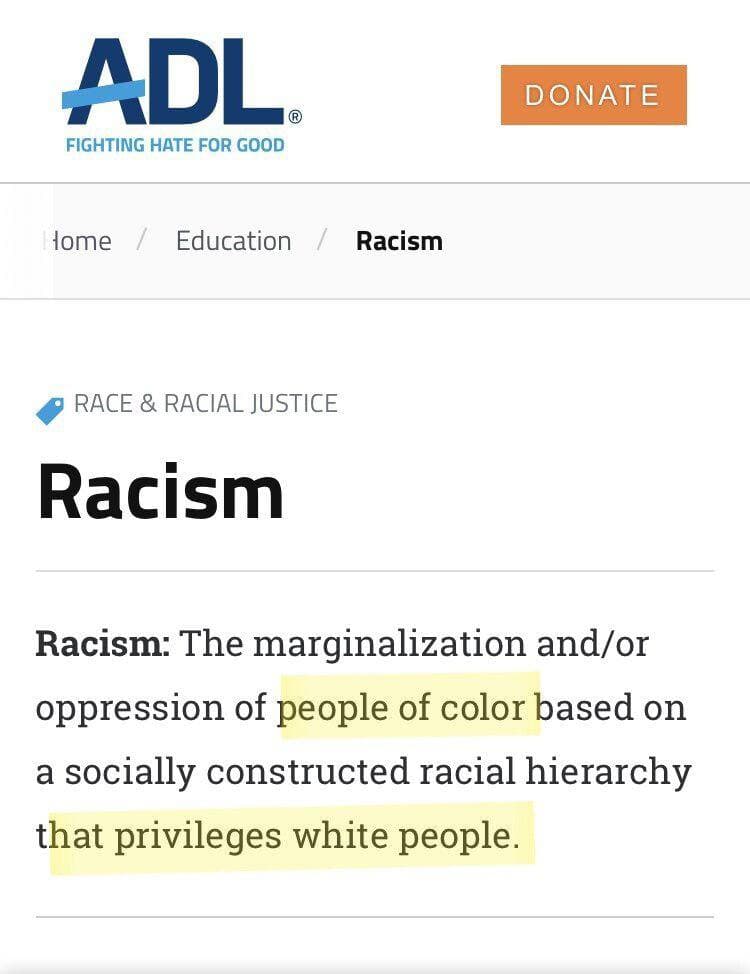 Definiția rasismului a fost schimbată de Liga Anti-Defăimare, o organizație jidanească ce stipulează în noua definiție a rasismului că doar albii pot fi rasiști pentru că ierarhia rasială construită social privilegiază persoanele albe.