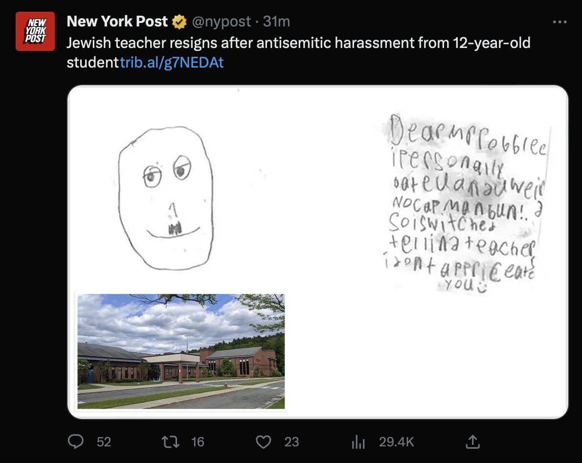 Un profesor iudeu de gimnaziu din Massachusetts a demisionat după ce s-a confruntat cu hărțuirea antisemită de către un elev de 12 ani – care ar fi făcut glume naziste și i-a trimis un desen cu Adolf Hitler.