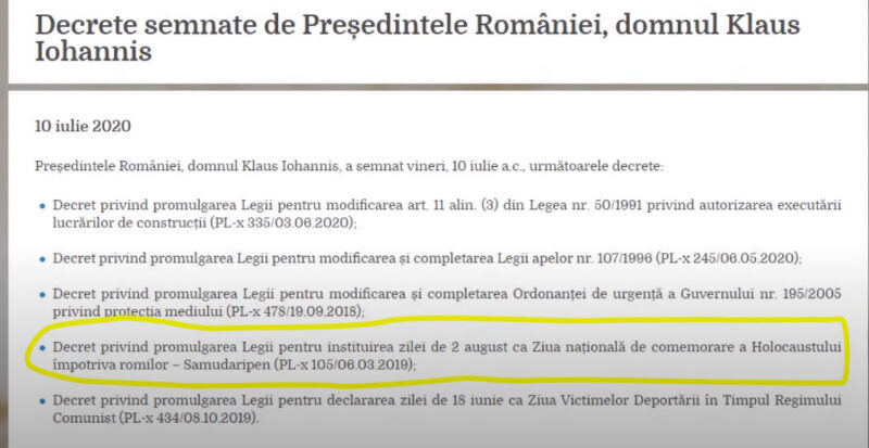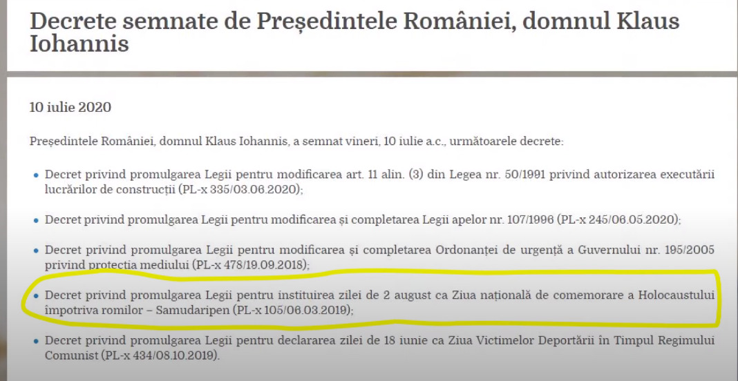 Președintele a semnat un decret prin care instituie o zi națională a pretinsului holocaustul al țiganilor, ziua de 2 august. Cei de la ND au taxat acest act, prezentându-l încă de la începutul emisiunii, declarând că în cazul în care vor intra în Parlament, îl vor anula.