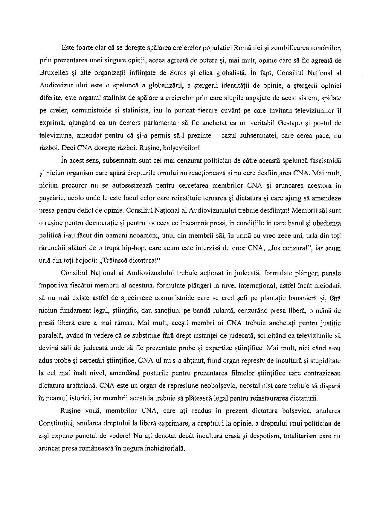 Foarte frumos că doamna Diana Șoșoacă adresează problema fundamentală a cenzurii și a libertății de exprimare din România, însă CNA este un vârf de aisberg în aparatul cenzurii, un fragment dintr-un tot, iar o declarație completă despre acest subiect nu trebuie să se rezume la a cere desființarea CNA-ului, ci trebuie să includă desființarea INSHREW (Institutul pentru studierea holocaustului în România, Elie Wiesel, institut care ne redenumește străzi și ne inventează legi represive), desființarea Centrului pentru Monitorizarea și Combaterea Antisemitismului (condus de Marko Maximilian Katz, care nu este altceva decât un instrument de poliție a opiniilor pro-românești) și desființarea CNCD. Dacă urmează declarații separate pentru fiecare dintre acestea, foarte bine, însă o încercare autentică de apărare a libertății de exprimare trebuie să lovească la rădăcina problemei: – în legile antiromânești: