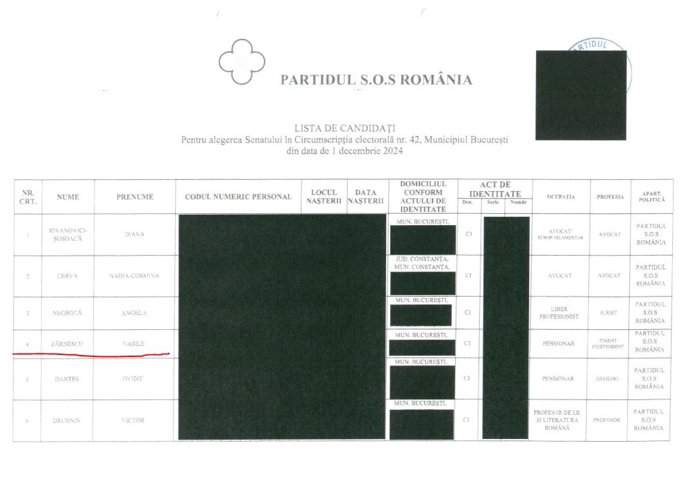 Vasile Zărnescu pe locul 4 la senat. Bucureștiul are arondat 13 senatori. 100:13=7,69; 7,69×3=23 procente ar trebui să ia SOS în circumscripția 42 București astfel încât Vasile Zărnescu să poată câștiga un mandat. Am luat în calcul că Diana rămâne europarlamentar. Nu știu ce calcule și-a făcut Vasile Zărnescu dar SOS nu este partid de două cifre. Mult succes.