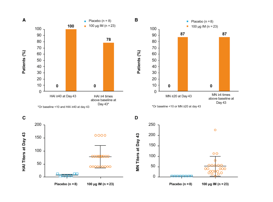 Rezultate: Vaccinurile IM – ARN-m H10N8 și H7N9 au demonstrat profiluri de inocuitate și reactogenicitate favorabile. Nu s-a semnalat niciun eveniment indezirabil sau grav, în legătură cu vaccinurile. Pentru H10N8 (N=201), titluri de IHO induse de o doză IM de 100 µg ≥ 1:40 la 100% și titluri MN ≥ 1:20 la 87,0% dintre participanți. Doza intradermică de 25 µg a indus titluri de IHO> 1:40 la 64,7% dintre participanți, comparativ cu 34,5 % dintre participanții ce au primit doza IM. Pentru H7N9 (9N=156), doze de IM de 10, 25 et 50 µg s-au atins titluri IHA ≥ 1:40 la 36,0%, 96,3% și 89,7% dintre participanți. Titlurile MN ≥ 1:20 au atins 100% în grupurile de 10 et 25 µg și 96,6% în grupul de 50 µg. Rata de sero-conversiune a fost de 78,3% (HAI) și 87,0% (MN) pentru H10N8 (100 µg IM) și 96,3% (HAI) și 100 % (MN) în H7N9 (50 µg). La medierea celulară semnificativă nu a fost detectat niciun răspuns, în cele două studii.
