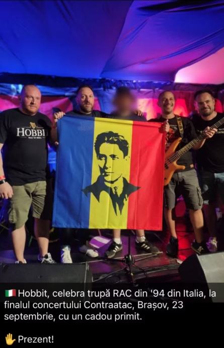Canalul de Telegram Casus Belli – cu 1.660 de urmăritori – a fost cel care a promovat cel mai mult evenimentul. De aici am aflat că trupa italiană de rock identitar și naționalist, Hobbit 1994, a plecat la finalul concertului cu un cadou – un steag al României care avea imprimat pe el un portret al lui Corneliu Zelea Codreanu.