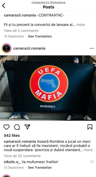 În această postare a grupului Camarazii, se afirmă că România nu recunoaște independența Kosovo, dar că „echipa națională a României este forțată de UEFA să joace meciul din această seară la Priștina”.