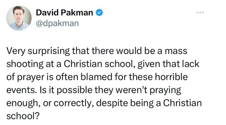Acest Shaviro nu este singur. Alt jidov, David Pakman, a ironizat rugăciunea și creștinismul într-un tweet în care spune că poate victimele nu se rugau destul sau corect și de aceea au pățit ceea ce au pățit. Acesta și-a șters postarea în urma revoltei populare.