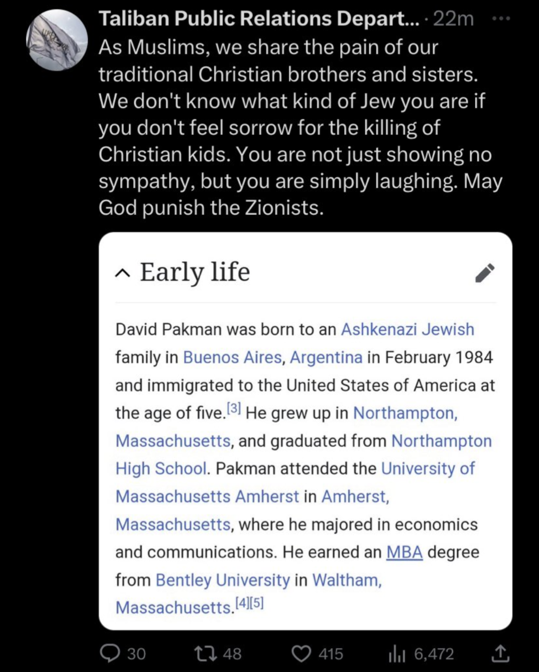 Ba mai mult, Talibanii au postat un link la secțiunea “Early Life” de pe wikipedia lui David Pakman, secțiune unde i se menționează etnia.