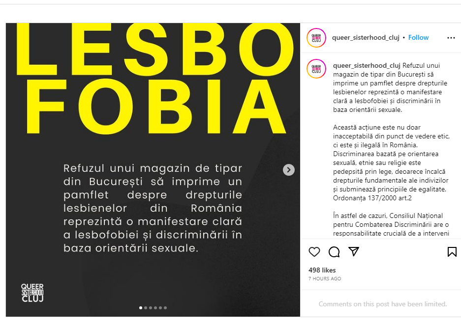 Un magazin din București a refuzat să tipărească materiale pentru lesbiene, selectându-și clientela conform propriilor principii. Acest lucru nu a fost pe placul feministelor, care au început o “vânătoare” împotriva imprimeriei Easy Shop din București.