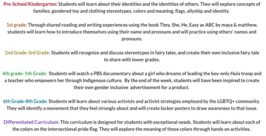 „Elevii și profesorii vor lua parte, timp de o săptămână, la un curs care sărbătorește și afirmă identitățile LGBTQ+, cu scopul de a cultiva într-o manieră mai profundă «parteneriatul și susținerea» în școlile noastre și de a crea un mediu mai primitor și incluziv pentru fiecare copil și adult.”, scrie într-un email trimis părinților.