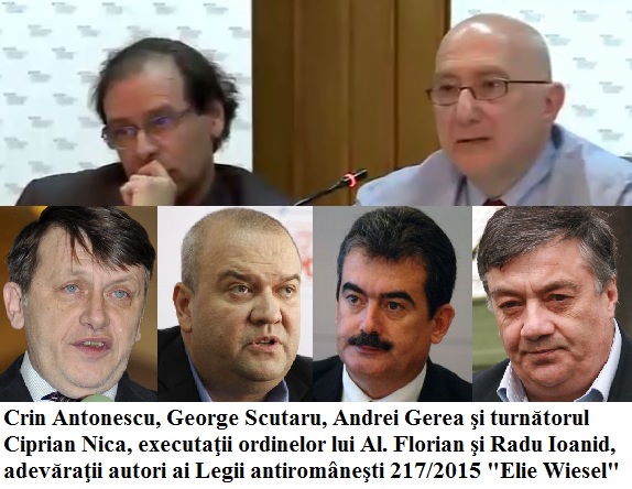 Referitor la una dintre acestea, Legea nr. 217/2015, zisă chiar „legea antilegionară“ (o comentatoare a supranumit-o, corect și inspirat, „legea ilegitimă“, iar ziaristul Ion Spânu a poreclit-o, mai clar și mai dur, „legea fără-de-lege“!), care a stîrnit multe și vehemente critici[35], Lucia Hossu-Longin se întreba retoric: „Unde văd aceşti domni iniţiatori ai legii recrudescenţa fenomenelor fasciste, legionare, rasiste, în România? (…) Legea nu slujeşte democraţia, ci o subminează. (..) Eu personal, ca autoare a Memorialului durerii, voi face plângere penală iniţiatorilor legii pentru ca acest document să fie retras şi reformulat în termeni europeni“[36]. Nu știu ce înțelegea ea prin „termeni europeni“ și nu știu ce s-a ales de lauda cu iminenta sa plîngere penală (dacă o mai fi făcut-o), dar Legea nr. 217/2015 este în vigoare și-și face efectul scontat[37] de cvintetul inițiatorilor – Alexandru Florian-Aurel Vainer-Crin Antonescu-Andrei Gerea-George Scutaru –: atît de a-i băga pe românii patrioți la pușcărie, cît și de a-i condamna a doua oară și de a-i ponegri post mortem pe martirii naționaliști[38]. Și, culmea absurdului, arbitrariului și a tupeului, Crin Antonescu[39] avea să fie propus de către Ilie Bolojan-Buldogu’[40], liderul clicocrației cleptocrate, ca candidat la prezidențiale, spre a-l șunta pe Călin Georgescu! Adică este propus să îi ia locul sinistrului președinte alogen Klaus Werner Iohannis, pe care tot el, Crin Antonescu-Vorbete, l-a adus din Primăria Sibiului ca să-l facă prim-ministru tehnocrat, dar a sfîrșit prin a fi președinte cleptocrat în urma manevrelor politicianiste ale „liberalilor-monarhiști“ (horribile dictu; sintagma „liberal-monarhist“ este o schizofrenie politică)! După ce, anterior, la presiunea duetului ticăloșilor din I.N.S.H.R.-„E.W.“, frații vitregi Al. Florian și Radu Ioanid, cvartetul malefic „Crin Antonescu-Vorbete, Andrei Gerea, George Scutaru și turnătorul Ciprian Nica“ a impus criminala O.U.G. nr. 31/2002!