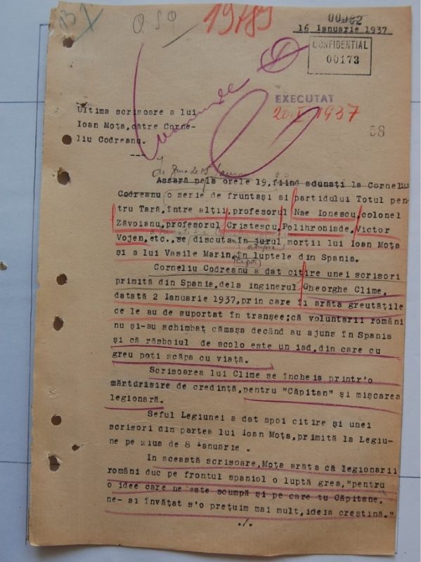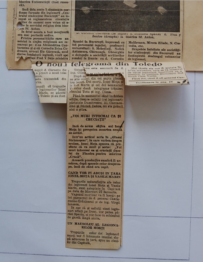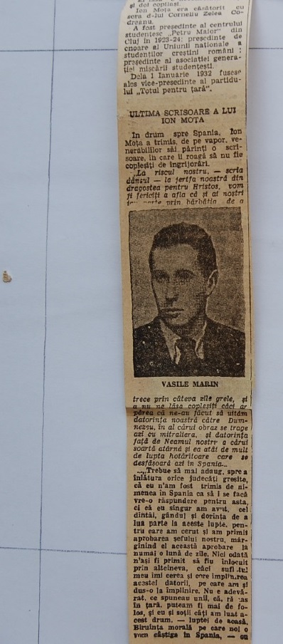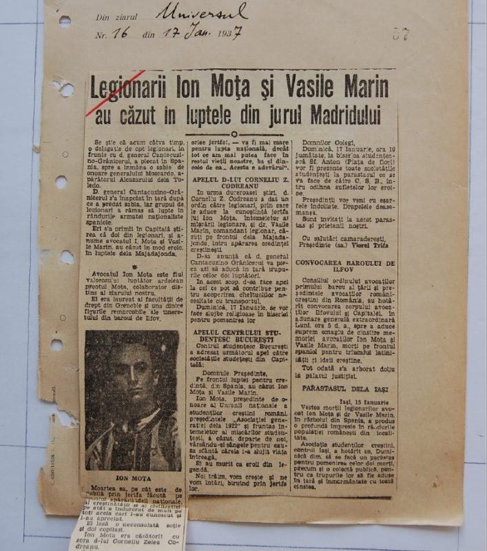 Acum câteva zile (la 23 aprilie 1937, vezi C. Z. Codreanu, Circulari si Manifeste, n.r.), printre bagajele legionarilor întorsi din Spania s-a gasit un mic cufaras apartinând lui Ion. I. Mota.