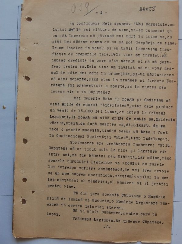 Dupa aceste lucruri personale, iata, deoarece e vorba de despartire, îti urez ocrotirea lui Dumnezeu si biruinta cât mai apropiata. Sunt fericit si mor bucuros cu aceasta multumire, ca am avut putinta de a simti chemarea ta, de a te întelege si de a te servi. Caci tu esti Capitanul! Ti-am si gresit, si ce stii si ce nu stii. Iarta-ma. N-am gresit însa niciodata nimic celei mai sincere fidelitati legionare si fidelitatii fata de tine, Capitanul. N-am facut destul pentru Legiune în ultimii ani, dar am crezut si cred în tine si fata de aceasta credinta n-am pacatuit vreodata nici în cea mai ascunsa cuta sufletului meu (chiar daca uneori mai criticam câte ceva, cu buna credinta, ca de pilda lipsa ta de atasament fata de forme si contabilitati, care aduc adeseori mari neajunsuri de fond).